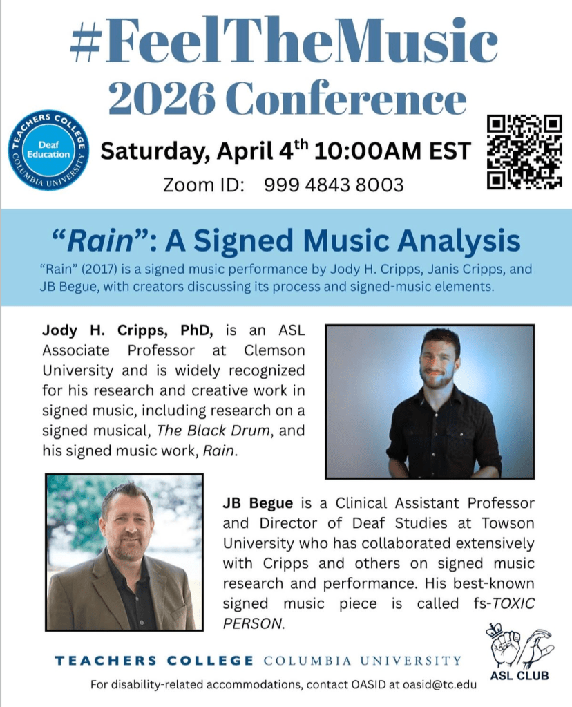 #FeelTheMusicTC 2026 Conference deafmusicprojectApril 4, 2026#feelthemusic Conference, Deaf Music Project Post navigation Previous View Jody H. Cripps’ Signed Music: “Rain” View JB Begue’s Signed Music: “fs-TOXIC PERSON” Share this: Share on X (Opens in new window) X Share on Facebook (Opens in new window) Facebook Like Loading...
